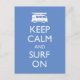 Keep calm and surf on, with a icon of a van with a surfboard on top