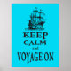 "Keep Calm and Voyage On," romanticizes aspects of the unknown, reminiscent of seafaring adventure, the search for lost treasure, secret maps on brittle parchment paper and life on the open ocean. To voyage on is to persist, the blue background represents the deep ocean and life’s challenges.