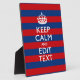 Have your personalized Keep Calm saying on this fine custom gift for yourself or for someone special on your list. Offered on a vibrant red and blue stripes decor. Humorous or whimsical try on your creative words on the two editable text fields you see on this product page. Remember to use CAPITAL letters for best results.