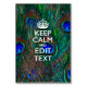 Your personalized Keep Calm saying on a fine custom colorful peacock feathers style decor. A personalized Keep Calm style saying on a one of a kind gift. Humorous or whimsical try on your creative words on two editable lines of text. Remember to use CAPITAL letters for best results.