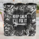 This bold monochrome graphic features the encouraging phrase "KEEP CALM I'LL FIX IT" with a prominent wrench symbol. The text is set against a distressed black background, which is surrounded by a chaotic yet detailed collage of various mechanical parts like gears, pistons, and pipes in grayscale. This industrial design conveys a confident and capable message for anyone involved in repairs.