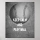 This keep calm quote poster has a baseball in gray and white with text keep calm and play ball for wall art decor in home or office.