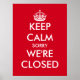 Keep calm sorry we're closed window or door sign poster. Also available as open sign or customize. Funny signage for shop, store, restaurant, company office etc. Make your own funny keep calm and carry on parody for your entrance. Vintage keepcalm typography template with crown. Also funny for college dorm room.