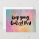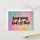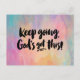 Modern Typography design with words in black calligraphy script, "Keep Going. God's Got This!" on colorful watercolor background.