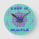 The central motif showcases a symbolic blue and gold crown, representing focus and inner royalty. This crown is set against a dynamic, geometric background: a teal/mint grid pattern overlaid with a purple and white radiating starburst. The powerful message "KEEP IT SIMPLE" boldly frames the top and bottom of the design. This combination of clean geometry and motivational symbolism is ideal for anyone seeking clarity and a mindful approach to their daily life.