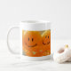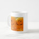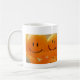A cheerful fun mug for your tea or coffee to be drunk from, featuring photographic image of bright orange faced balloons on one side and text saying "keep on smiling" on the other