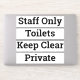 Collection of Four Door Signs. Staff Only; Toilets; Keep Clear; & Private. Colour black. Change wording to suit your needs.