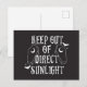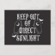 A spooky Victorian-style warning label with coffins and bats, reading "Keep Out Of Direct Sunlight."