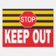 Attention getting Keep Out sign with a stop sign icon and yellow caution stripes to keep people out of private property or dangerous areas.