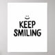 An inspirational typography quote art print that says Keep Smiling in a simple black and white design. Promote positivity and happiness with this cheerful design.