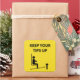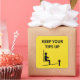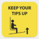 A tip jar sticker that says, "Keep your tips up" showing a skier on a chairlift with the unloading warning to keep your tips up