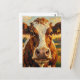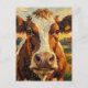 a cute postcard to say hi and keep in touch with friends and family featuring a cute impasto style cow standing on a farm. Close up of his face and a farm background.