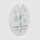 Modern keepsake baby's first Christmas personalize ornament with baby's name, your favorite photo and line art of cozy reindeer wearing baby blue sweater and boots.
