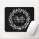 Floral Wreath Calligraphy Typography Monogram Mouse Pad in Black and White - Stylish black and white monogrammed mousepad gift for a newly wed couple that features a custom monogram, groom & bride names, last name, and wedding date templates surrounded by a bold floral line art wreath. A thoughtful keepsake gift for a couple's housewarming party or wedding present. ©sweetwhimsypaperie