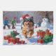 A fluffy Keeshond runs joyfully through the snowy landscape, wearing a festive red Christmas hat. The winter scene highlights the breed’s thick coat, expressive face, and cheerful personality while celebrating the warmth and spirit of the holiday season. A heartwarming design full of festive charm.