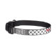 Good quality and fit is perfect for our Treeing Walker Coonhound/Beagle mix - about 45lbs and 15” neck. I wish it was pink all around (why I took off 1 star) but goid quality, printing! See above description - I added the flower to her collar in the photos