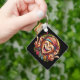 The key chain is made of metal and really sturdy. The flower design is really cheerful. The logo and colors are clear and crisp!