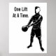 A vector in black of a lean and fit male doing lifts with a kettlebell weight. Negative space is used for the outlines. The text reads "One Lift at a Time" which is a reminder that there is no shortcut to fitness and being lean and looking good. A change is only possible with every effort put in. You can also personalise to your own message.