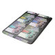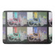 The colorful artwork on this large Bath Mat was made from an original photograph by ZoeSPEAK of a bicycle parked outside a shop in Key West, Florida. Clothing from the shop hangs on the open door behind the bicycle. The photo is done in four color schemes, red bike, blue bike, green bike and yellow bike, with corresponding clothing colors. The backgrounds are in muted shades of mauve and olive grays, and the overall background is a marbled black.