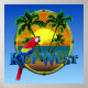 Key West beach sunset painting with palm trees, round bamboo frame, and a colorful parrot.