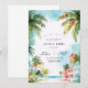 This wedding invitation features a beach scene in Florida Keys where a beach is filled with palm trees and local greenery, with key wet houses\stores vibes.