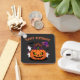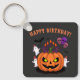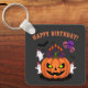 Cartoon pumpkin birthday cake with skull balloons, ghosts in party hats, creepy candles, and bats for a spooky Halloween birthday.