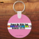 This is key chain is special because of the following : Genesis 43:23 bible verse Peace Be With You, vibrant multi-color squares and vibrant light pink background