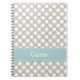 This cute and pretty khaki and white polka dot spiral bound notebook cover with a floating dot pattern can be personalized with your name on the stitched eggshell blue and white ribbon design. It is equally great for home office supplies or back to school use. Designed © Chrissy H. Studios, LLC. All Rights Reserved.