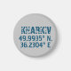 Modern magnet design features latitude and longitude coordinates for Kharkiv, Ukraine in distressed dark blue font on gray background