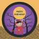Some black and purple stickers with an Asian child wearing a devil costume to go trick or treating . Text is editable .