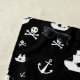 A kid’s pirate themed beach towel with a pattern of anchors, ships, and smiling skull and bones. The color scheme is black and white. Simply customize the name, add this towel to your cart, and get out to the beach!