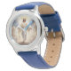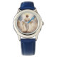 Kids classic leather watch is shown with an art print of Jesus on the watch face and has blue leather straps.