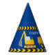 Cool custom construction birthday party hat for a kid who loves yellow construction vehicles on a blue background. Fun vehicle party favor for a little boy who will love cars and trucks. Customize with your kid's name under the black and yellow caution tape.