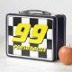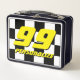 Kid's custom lunch box with checkered car race flag design. Retro style metal lunch box with name of child and number. Personalized gift ideas for little boys and girls going to kindergarten and preschool. Classic metallic lunchbox with handle. Cute Birthday or Holiday gift idea for son, grandson, granddaughter, daughter, cousin, nephew etc. Add your own name, monogram initials or funny quote. Available in many colors. Cool back to school supplies with automotive theme.