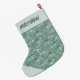 This cute personalized kids Christmas stocking design features a blue and green dinosaur fossil pattern on the front and back, with Jurassic plants, Dino skeleton bones, and other archaeology illustrations. There is also space for you to add your boys name in whimsical typography. The perfect dinosaur themed gift for any history or dinosaur enthusiast this holiday season.