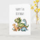 This adorable watercolor design includes watercolor dinosaurs in various hues of red, blue, and green. This dinosaur birthday card design also includes the phrase "Happy Birthday!" on the front of the card. The inside of the card includes a place to add a name as well as the phrase "Hope your birthday is T-riffic!"