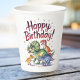 This cute green dinosaur happy birthday paper cup design shows adorable watercolor dinosaurs of various colors. This design also shows festive confetti as well as the phrase "happy birthday". The main color scheme is greens, reds, and blues. Enjoy this fun kids birthday party paper cup design!