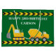 Cool custom green construction truck birthday party gift bag for a kid who loves yellow construction vehicles in black and yellow. Fun vehicle party gift with an excavator and concrete cement mixer for a little boy who will love cars and trucks. Customize with your kid's name under the black and yellow caution tape.
