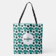 Kids Green Soccer Ball Pattern Personalized Unique Tote Bag. Two sizes and strap lengths available. Personalize and monogram this fun sports themed tote bag for a custom gift. Green background with a pattern of geometric soccer ball shapes on front and back. A white circle in the center on the front side show name in black and initial in green in an easy to read font. Sports tote bag makes a great gift for soccer loving kids. Customize to change background colors from green to any other color.