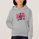 Kids pullover hoodie is shown in the light steel color with a patriotic July 4th USA print, this hoodie is made of quality materials and craftsmanship.