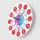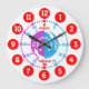 Colorful kids graphic wall clock color coded to help assist your child to read a clock. This colorful teaching aid includes minutes and hours and past and to color coding making child's play of telling the time. Designed exclusively by Sarah Trett. A great addition to a child's bedroom or play room for children who are learning to read a clock face. color coded in purple, blue and red.