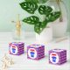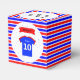 A great idea for both boys and girls parties, this fully customizable kids 10th birthday party favor box is in bright red and blue colors. Enter the name of the birthday girl or boy by typing in the boxes above. The sports top image with the name in white text appears on both the front and back of the party box, in a white circle with a scattering of blue stars.
