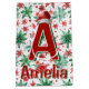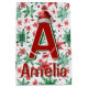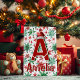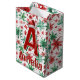 Kids personalized Christmas gift bag, red and green snowflakes, their first initial with santa hat and their name.