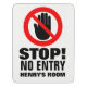 Simple bold warning signage design. Instruct other brothers and sisters to keep out with this fun hand off the door symbol no entry bedroom door sign. Personalize this graphic door sign with your own name. Currently reads Stop! No entry Henry's room. Design by Sarah Trett for www.mylittleeden.com