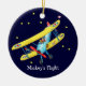 Ceramic ornament with the illustration of a cartoon biplane. The kid pilot takes a flight together with the dog and the cat. Put your own text on the ornament and choose your own background colour! Great ornament to hang in a kid's room.