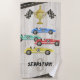 Beach towels are a staple of childhood summer days at the beach, pool, or lake, but now they can do much more – they can become a personalized statement of your child’s interests, hobbies, and individual style. This summer, make your child’s beach day extra special with a boys personalized beach towel featuring a rustic wooden background, 4 watercolor race cars, roads, checkered flags, a gold trophy, and their name and initial.