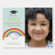 A rainbow kids preschool or kindergarten graduation theme featuring an illustration of a rainbow, blue sky and graduation cap. Personalize the photo.