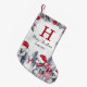 Cute kids red christmas stocking featuring a washed out gray background, elegant watercolor xmas florals & foliage, adorable baby penguins, snowman, gifts, and a elegant personalized template incorporating your childs initial and name.