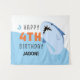 Shark birthday backdrop for kids. 4th birthday sign in blue and orange for a boy or girl's fourth b-day decorations.