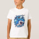 This kid's shirt is shown with a shark art print, Shirt is shown in cotton with a crew neck and short sleeves.